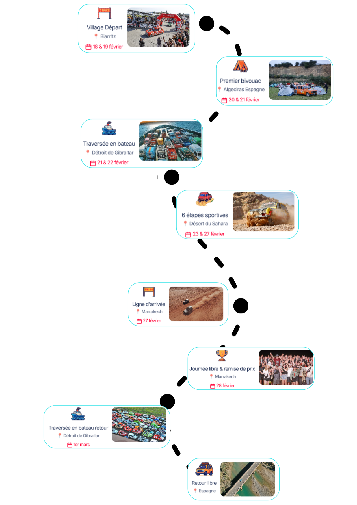 6000 km, à travers la France, l’Espagne et le Maroc. Une orientation à l’aide d’un roadbook et d’une boussole, mettant en avant le côté débrouillard.